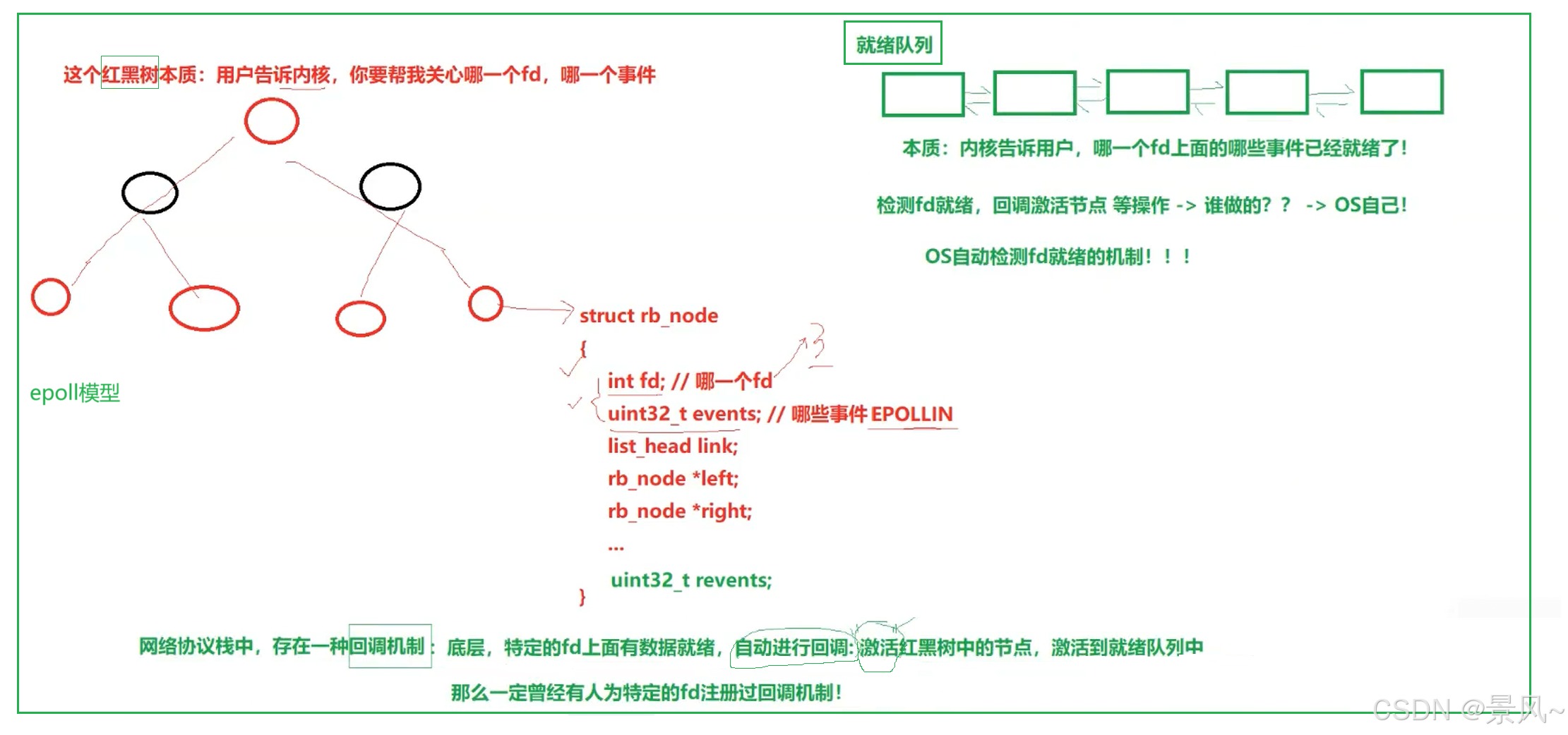 OS自动检测fd就绪”“自动进行回调”就是指内核检测到事件后,把对应节点加入就绪队列。