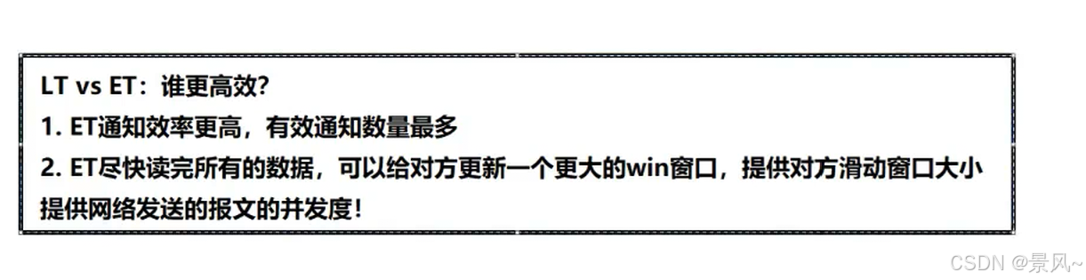 - ET工作模式下epoll通知用户的次数一般比LT少,因此ET的性能一般比LT性能更高,Nginx就是默认采用ET模式使用epoll的。
