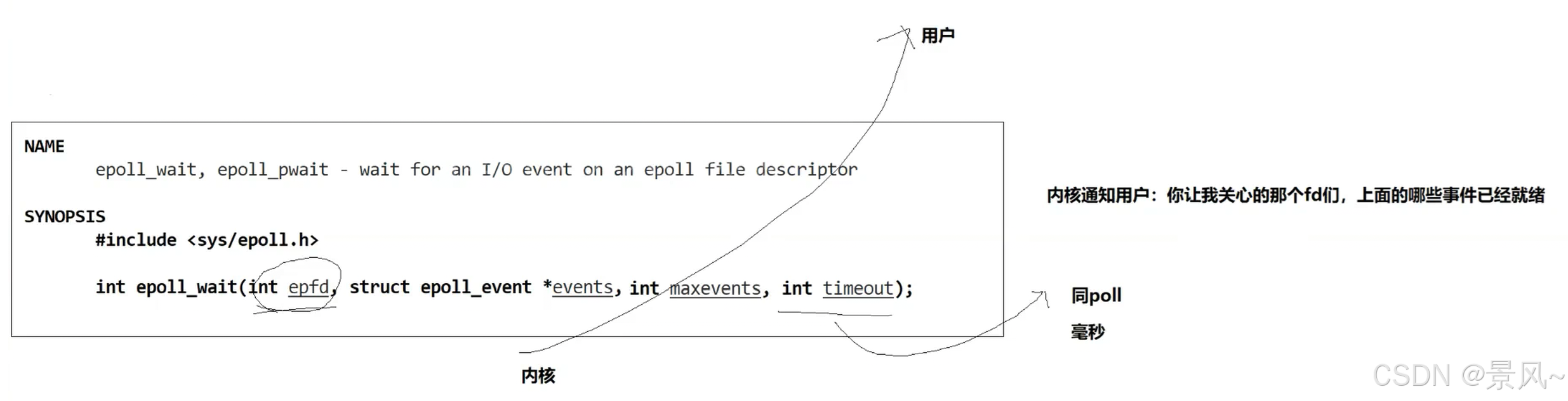 - events:内核会将已经就绪的事件拷贝到events数组当中(events不能是空指针,内核只负责将就绪事件拷贝到该数组中,不会帮我们在用户态中分配内存)。