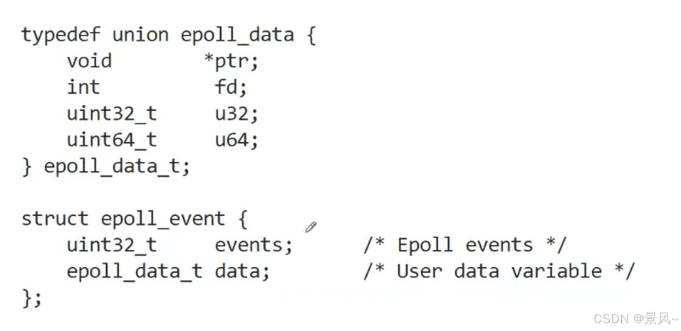 struct epoll_event结构中有两个成员,第一个成员events表示的是需要监视的事件,第二个成员data是一个联合体结构,一般选择使用该结构当中的fd,表示需要监听的文件描述符。