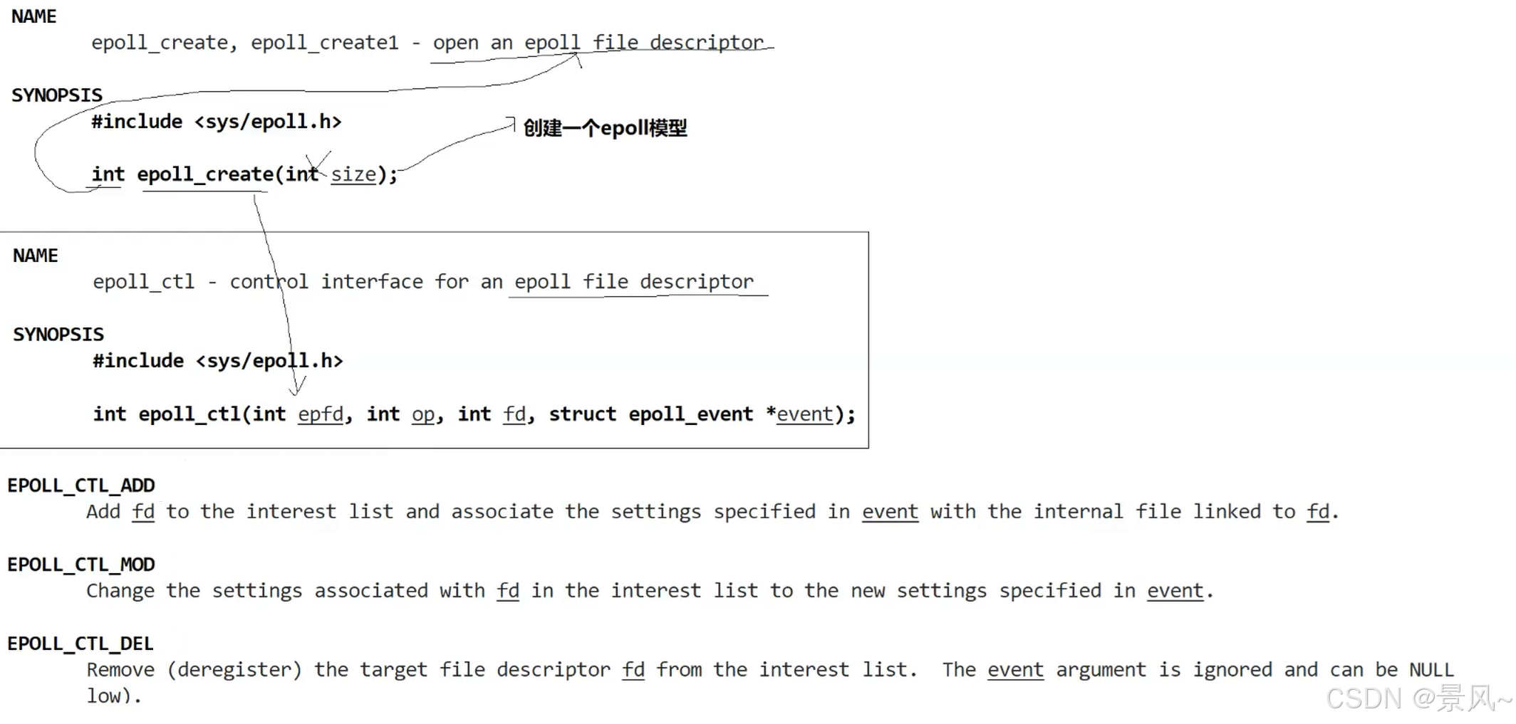 - EPOLL_CTL_ADD:注册新的文件描述符到指定的epoll模型中。
