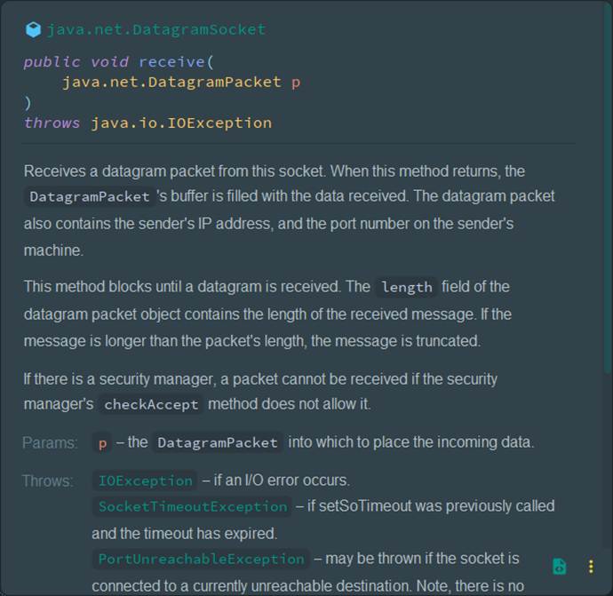 方法说明 从该套接字接收一个数据报包。当此方法返回时,DatagramPacket 的缓冲区会被接收到的数据填充。 数据报包同时包含发送方的 IP 地址 和发送方机器上的 端口号。 此方法会阻塞,直到有数据报被接收。数据报包对象中的 length 字段包含接收到消息的长度。 如果消息的长度大于包的长度,消息将被截断。 如果存在安全管理器,那么当安全管理器的 checkAccept 方法不允许接收时,该数据报包无法被接收。