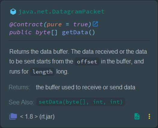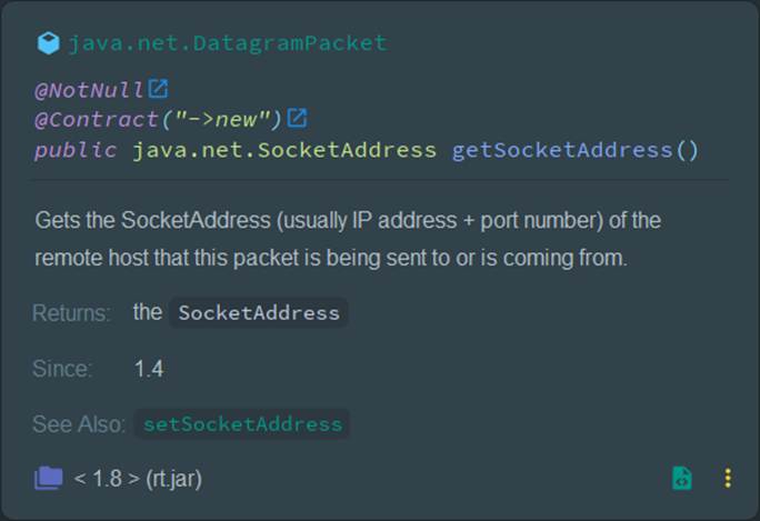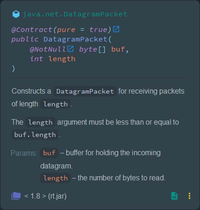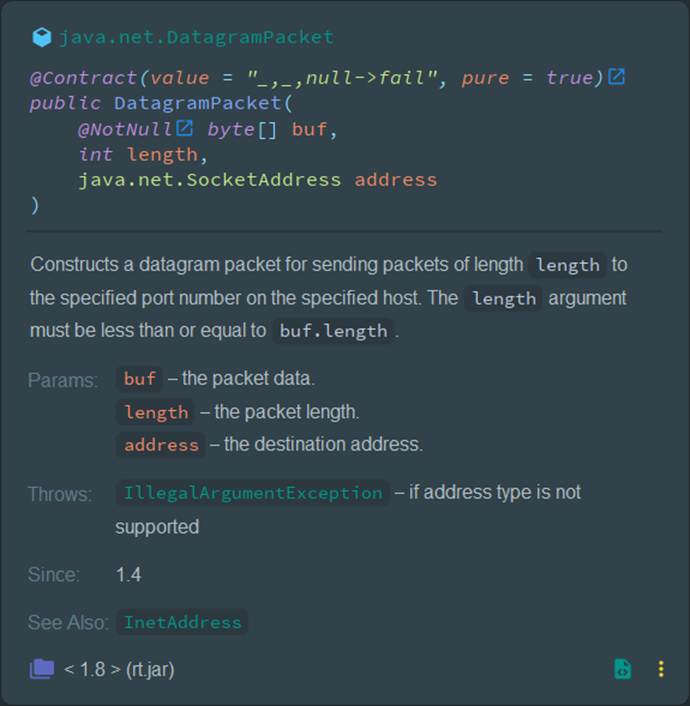 Java @contract(value = "_,null->fail", pure = true) public DatagramPacket( @NotNull byte[] buf, int length, java.net.SocketAddress address )