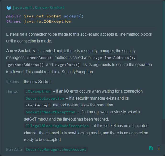 Java Socket socket = serverSocket.accept(); |