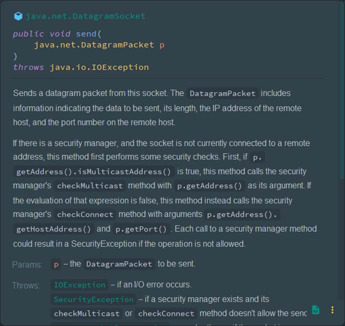 方法说明 从该套接字发送一个数据报包。 DatagramPacket 包含的信息包括:要发送的数据、数据长度、远程主机的 IP 地址,以及远程主机的端口号。 如果存在一个安全管理器,并且套接字当前未连接到远程地址,那么此方法会首先执行一些安全检查: 首先,如果 p.getAddress().isMulticastAddress() 为 true, 则此方法会调用安全管理器的 checkMulticast 方法,并将 p.getAddress() 作为参数传入。 如果上述条件的判断结果为 false,那么此方法会改为调用安全管理器的 checkConnect 方法, 传入的参数是 p.getAddress().getHostAddress() 和 p.getPort()。 对安全管理器方法的每一次调用,如果操作不被允许,都可能导致抛出 SecurityException。