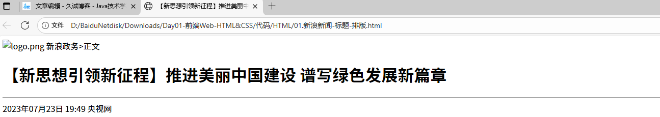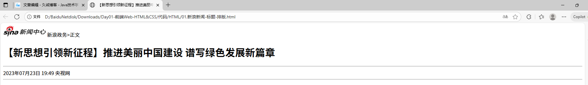 <body><img src="./img/logo.png" alt="logo.png"> 新浪政务>正文<!-- 标题标签 h1~h6 --><h1>【新思想引领新征程】推进美丽中国建设 谱写绿色发展新篇章</h1><!-- 水平线标签 hr --><hr>2023年07月23日 19:49 央视网<hr>