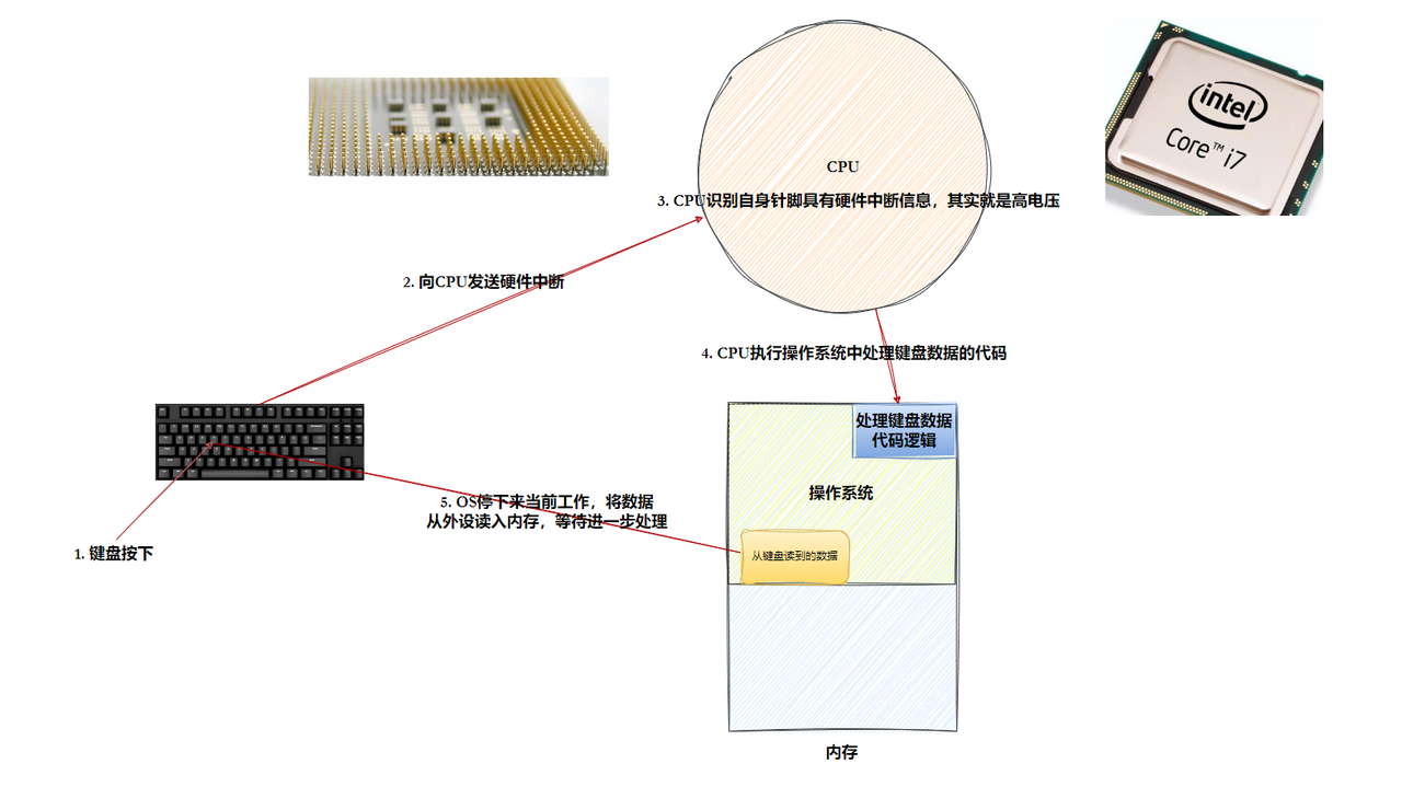 硬件中断也需要触发信号,比如在键盘按下的时候,硬件中断通知CPU读取按键信息,CPU再通过信号将按键信息传递给当前的终端进程。