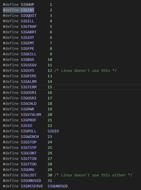 标准信号,即1 - 31编号的信号,它们是有预定义行为的,比如我们平时用的ctrl + c就是上面的SIGINT(2号)信号,它的作用就是中止进程。