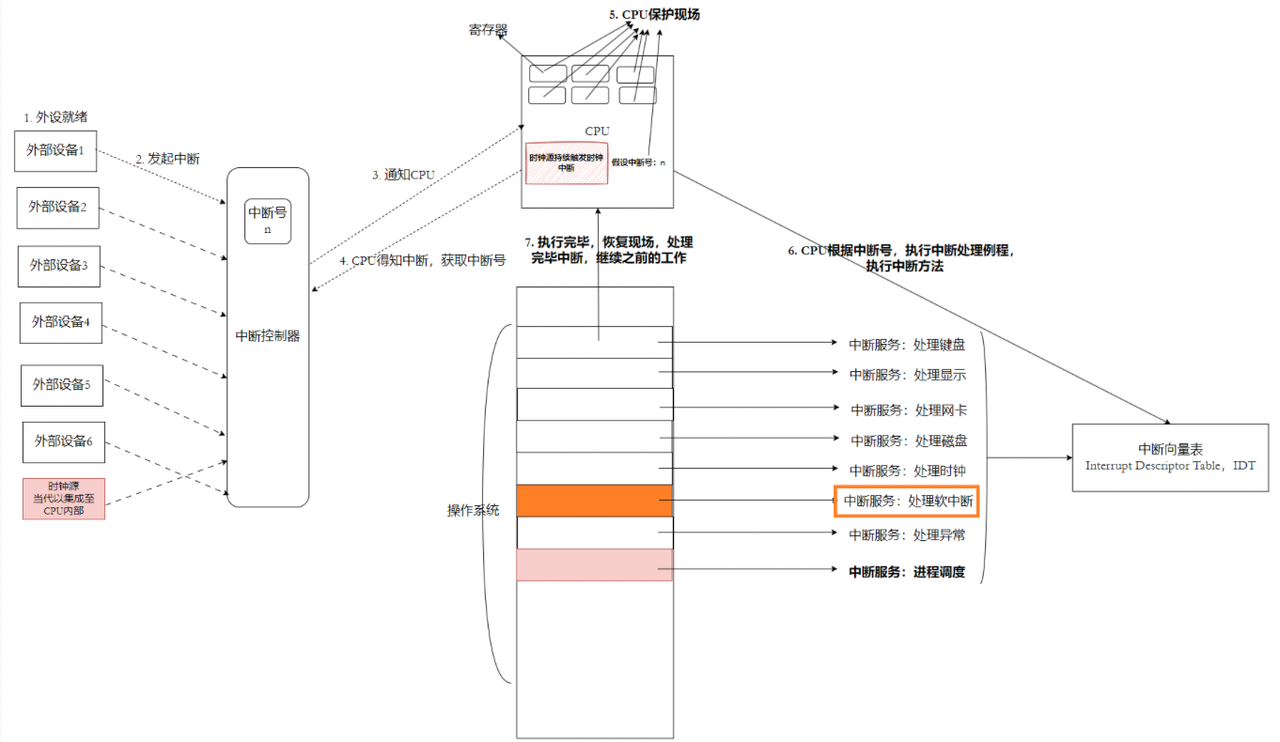 什么是硬件中断呢,硬件中断就是外部硬件设备(键盘、硬盘等的硬件设备)和内部硬件条件(内存检验错误等等)触发的异步信号。当外部设备向CPU发送要处理的事件时(比如键盘输入),这个外部硬件就需要向CPU发送中断信号,这个中断信号会通过中断控制器(如APIC、NVIC)向CPU发送中断请求,CPU在接收到中断信号后,会先暂停目前的工作,去执行中断服务程序(ISR)。