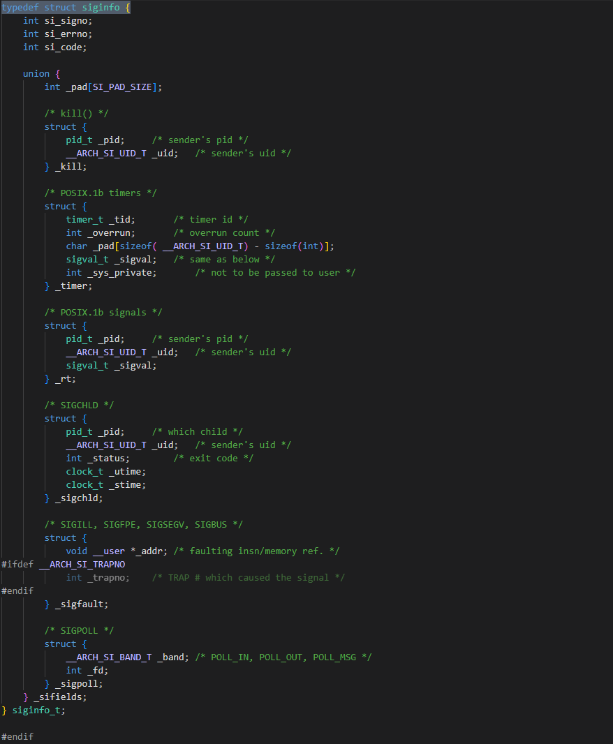 union {// ... 其他成员 ...// kill() 信号的附加数据 struct {pid_t _pid; // 发送者的 pid __ARCH_SI_UID_T _uid; // 发送者的 uid} _kill;// POSIX.1b 定时器信号的附加数据 struct {timer_t _tid; // 定时器 ID int _overrun; // 超限计数 // ... 其他字段 ...} _timer;// POSIX.1b 实时信号的附加数据 struct {pid_t _pid; // 发送者的 pid __ARCH_SI_UID_T _uid; // 发送者的 uid sigval_t _sigval; // 信号值 } _rt;// SIGCHLD 信号的附加数据 struct {pid_t _pid; // 子进程的 pid __ARCH_SI_UID_T _uid; // 发送者的 uid int _status; // 退出状态 clock_t _utime; // 用户 CPU 时间 clock_t _stime; // 系统 CPU 时间 } _sigchld;/* SIGSEGV 等信号的附加数据 */struct {void _addr; // 引发故障的指令/内存地址