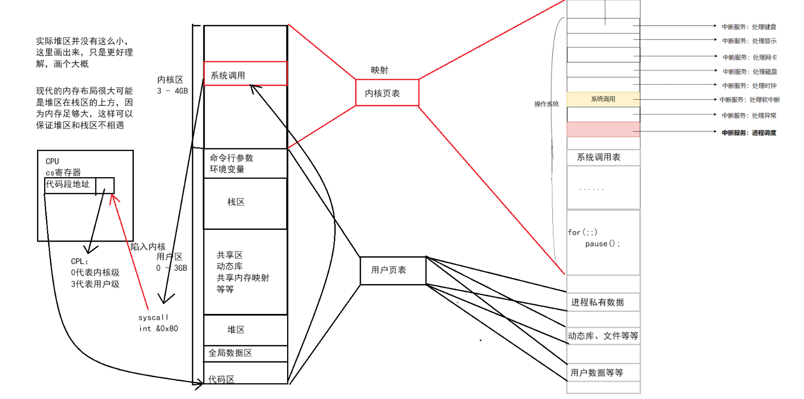 系统调用是在进程地址空间内的。⽤⼾态就是执⾏⽤⼾0 - 3GB时所处的状态,内核态就是执⾏内核3 - 4GB时所处的状态,它们通过CPL来区分——全称是CurrentPrivilegeLevel,即当前特权级别。