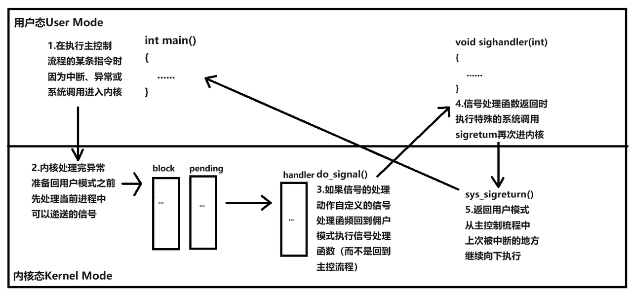 恢复执行:信号处理程序执行完毕后,进程返回到原来的断点继续执行。