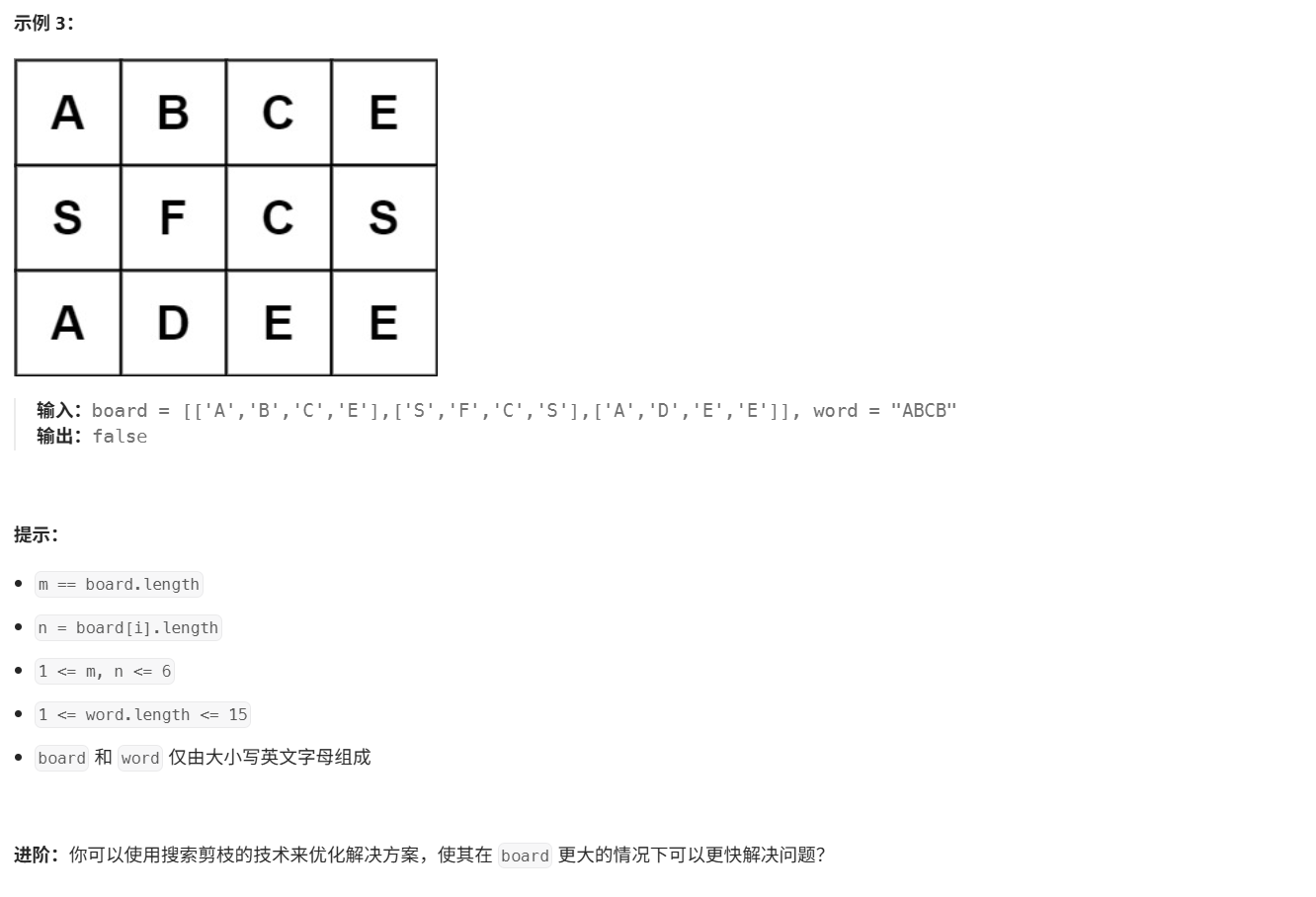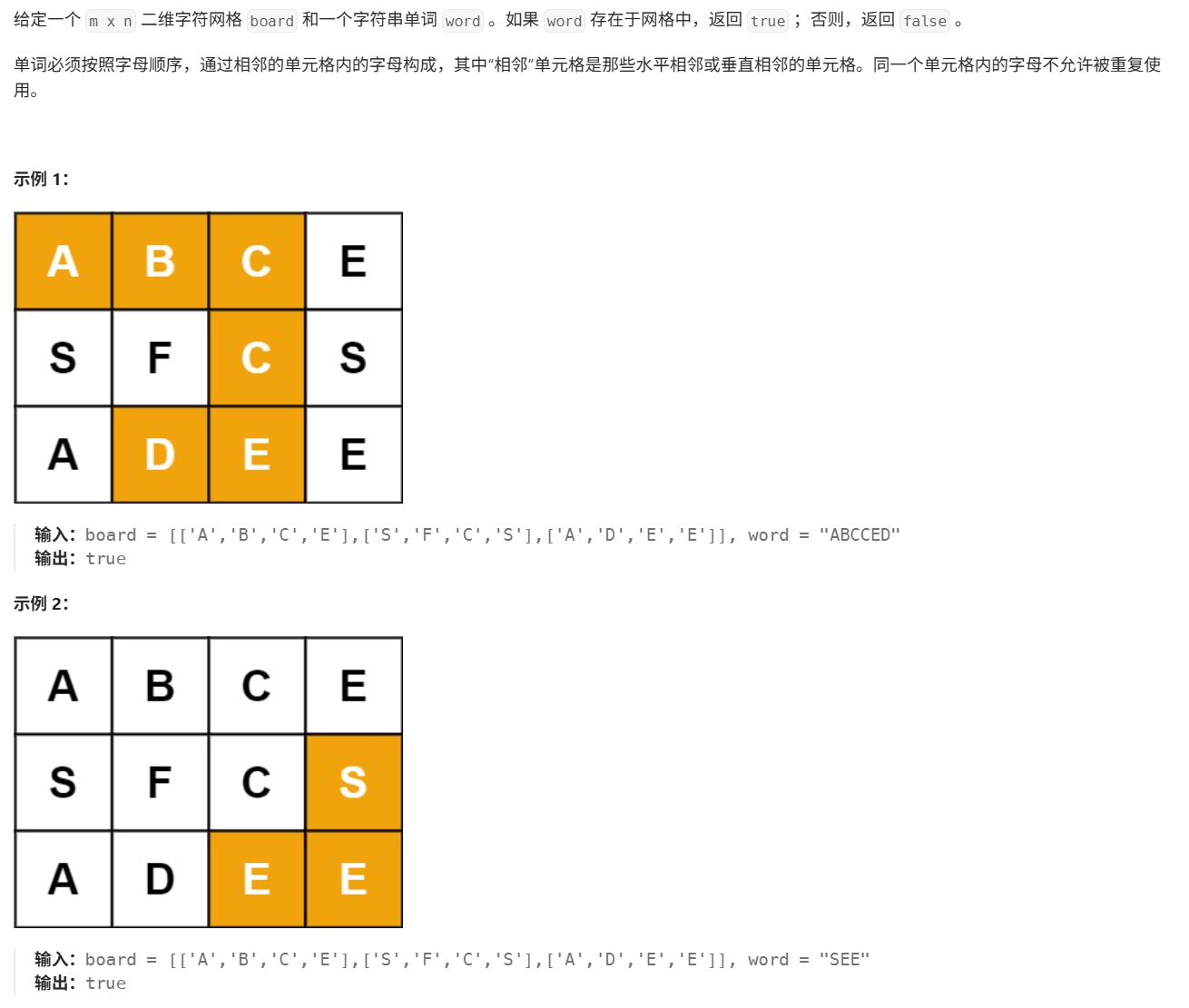 public:bool exist(vector<vector<char>>& board, string word) {m=board.size();n=board[0].size();visited.resize(m,vector<bool>(n,false));//寻找出口for(int i=0;i!=m;i++)for(int j=0;j!=n;j++){if(board[i][j]==word[0]){visited[i][j]=true;if(dfs(board,i,j,1,word)) return true;visited[i][j]=false;}}return false;}int dx[4]={0,1,0,-1};int dy[4]={1,0,-1,0};bool dfs(vector<vector<char>>& board,int i,int j,int pos,string word){//递归出口if(pos==word.size()) return true;for(int k=0;k!=4;k++){int x=i+dx[k];int y=j+dy[k];if(x>=0&&x<m&&y>=0&&y<n&&!visited[x][y]&&board[x][y]==word[pos]){visited[x][y]=true;if(dfs(board,x,y,pos+1,word)) return true;//恢复现场visited[x][y]=false;}}return false;}