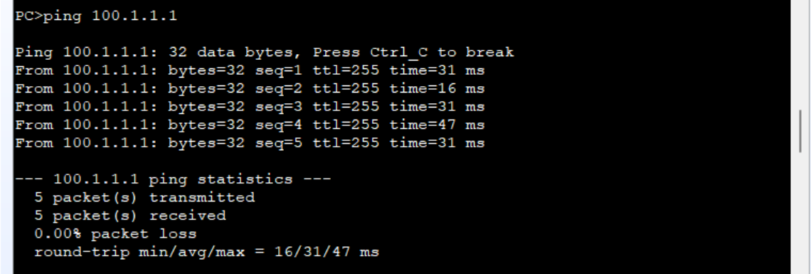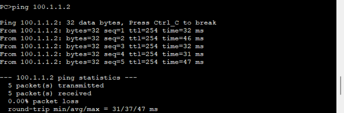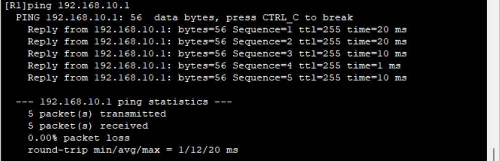 [R1]int g0/0/0 [R1-GigabitEthernet0/0/0]ip add 100.1.1.2 24 [R1-GigabitEthernet0/0/0]q[R1]ip route-static 192.168.10.0 255.255.255.0 100.1.1.1