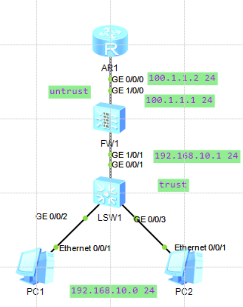 [FW1]int g1/0/1 [FW1-GigabitEthernet1/0/1]ip add 192.168.10.1 24 [FW1-GigabitEthernet1/0/1]service-manage ping permit 允许通过该接口对防火墙进行ping管理 [FW1-GigabitEthernet1/0/1]q [FW1]int g1/0/0 [FW1-GigabitEthernet1/0/0]ip add 100.1.1.1 24 [FW1-GigabitEthernet1/0/0]service-manage ping permit 允许通过该接口对防火墙进行ping管理 [FW1-GigabitEthernet1/0/0]q[FW1]firewall zone untrust 进入非受信区域(untrust zone)配置模式 [FW1-zone-untrust]add interface GigabitEthernet 1/0/0 将 G1/0/0接口加入 untrust区域 [FW1-zone-untrust]q [FW1]firewall zone trust 进入受信区域(trust zone)配置模式 [FW1-zone-trust]add interface GigabitEthernet 1/0/1 将 G1/0/1接口加入 trust区域 [FW1-zone-trust]q[FW1]security-policy 进入安全策略配置模式 [FW1-policy-security]rule name chu 创建名为 "chu" 的安全策略规则 [FW1-policy-security-rule-chu]source-zone trust 设置规则源区域为 trust 区域 [FW1-policy-security-rule-chu]destination-zone untrust 设置规则目的区域为 untrust 区域 [FW1-policy-security-rule-chu]action permit 设置规则动作为允许(permit) [FW1-policy-security-rule-chu]q[FW1-policy-security]rule name tu-local [FW1-policy-security-rule-tu-local]source-zone trust [FW1-policy-security-rule-tu-local]destination-zone local [FW1-policy-security-rule-tu-local]action permit [FW1-policy-security-rule-tu-local]q[FW1-policy-security]rule name local-un [FW1-policy-security-rule-local-un]source-zone local [FW1-policy-security-rule-local-un]destination-zone untrust [FW1-policy-security-rule-local-un]action permit [FW1-policy-security-rule-local-un]q[FW1-policy-security]rule name un-local [FW1-policy-security-rule-un-local]source-zone untrust [FW1-policy-security-rule-un-local]destination-zone local [FW1-policy-security-rule-un-local]action permit [FW1-policy-security-rule-un-local]q[FW1]nat-policy 进入NAT配置模式 [FW1-policy-nat]rule name tr-un 创建名为 "tr-un" 的NAT策略规则 [FW1-policy-nat-rule-tr-un]source-zone trust 设置NAT规则源区域为 trust 区域 [FW1-policy-nat-rule-tr-un]destination-zone untrust 设置NAT规则目的区域为 untrust 区域 [FW1-policy-nat-rule-tr-un]action source-nat easy-ip 配置源NAT动作,使用 easy-ip 方式(使用出口接口的IP地址作为转换后地址) [FW1-policy-nat-rule-tr-un]q