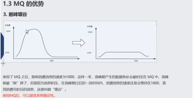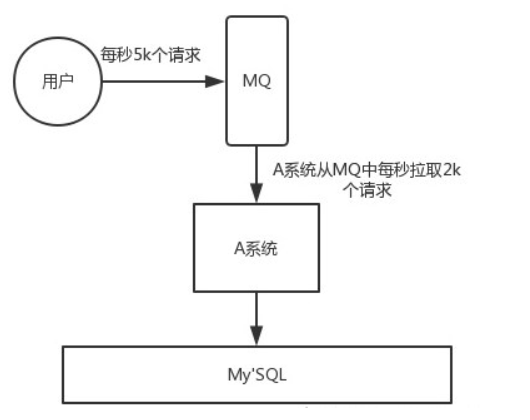 如果使用 MQ,每秒 5k 个请求写入 MQ,A 系统每秒钟最多处理 2k 个请求,因为 MySQL 每秒钟最多处理 2k 个。A 系统从 MQ 中慢慢拉取请求,每秒钟就拉取 2k 个请求,不要超过自己每秒能处理的最大请求数量就 ok,这样下来,哪怕是高峰期的时候,A 系统也绝对不会挂掉。而 MQ 每秒钟 5k 个请求进来,就 2k 个请求出去,结果就导致在中午高峰期(1 个小时),可能有几十万甚至几百万的请求积压在 MQ 中。