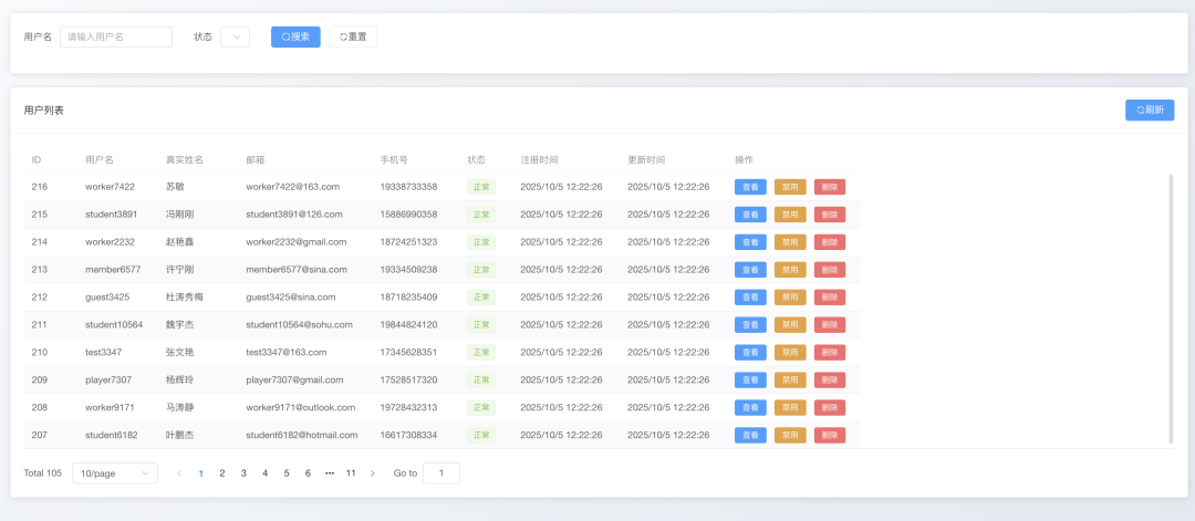 展示用户列表,从数据库获取的,实现启用/禁用,删除,查看等功能。