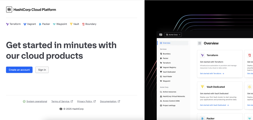 首先找到一个目标网站的,樱木这里找到的是:https://www.hashicorp.com/en/products/vault,HashiCorp 整个公司的产品页面,都拥有非常专业和清晰的设计,深色主题搭配亮色点缀。