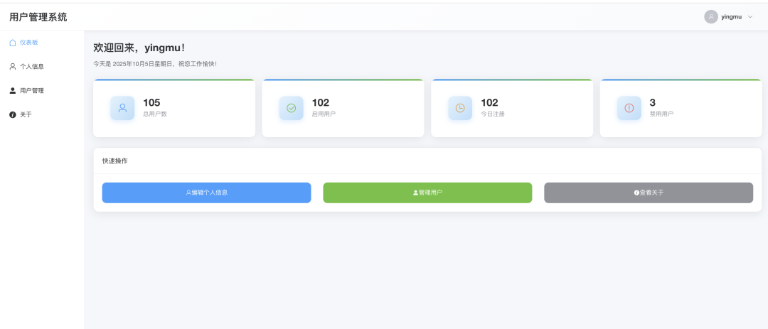 2、控制台页面,http://localhost:5173/dashboard,显示的总用户数,活跃用户、今日登录、禁用用户,需要是真实用户统计数据。