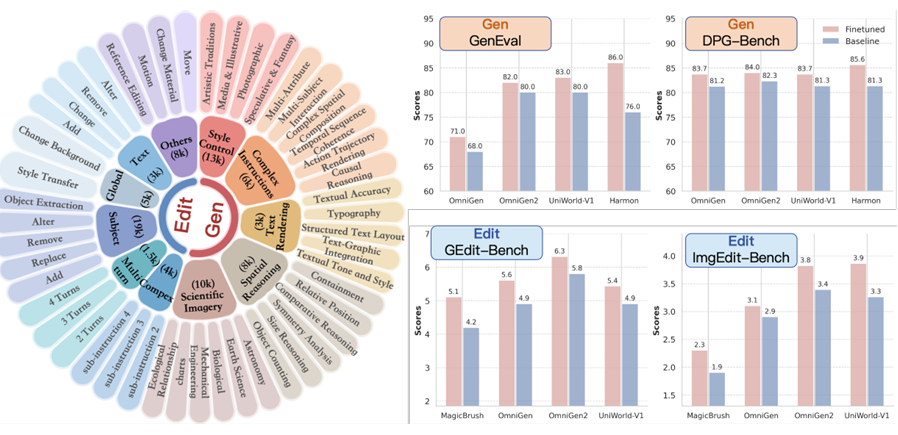 - 性能提升验证:通过实验验证,展示在OpenGPT-4o-Image数据集上微调的模型在多个基准测试上的性能提升。