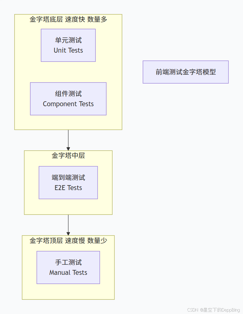 测试金字塔是自动化测试领域的经典模型,它将测试分为三个层次,越向下,测试速度越快、成本越低;越向上,越贴近用户真实场景,但速度越慢、成本越高。前端测试金字塔如下所示: