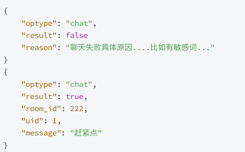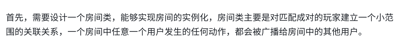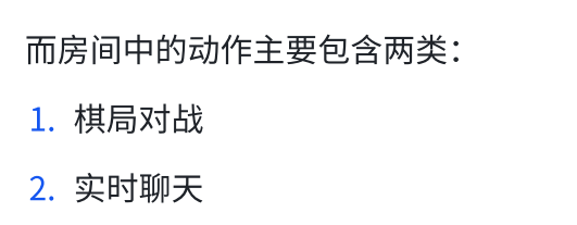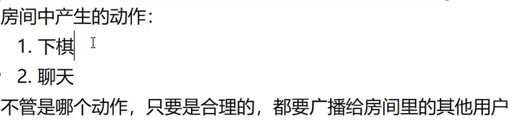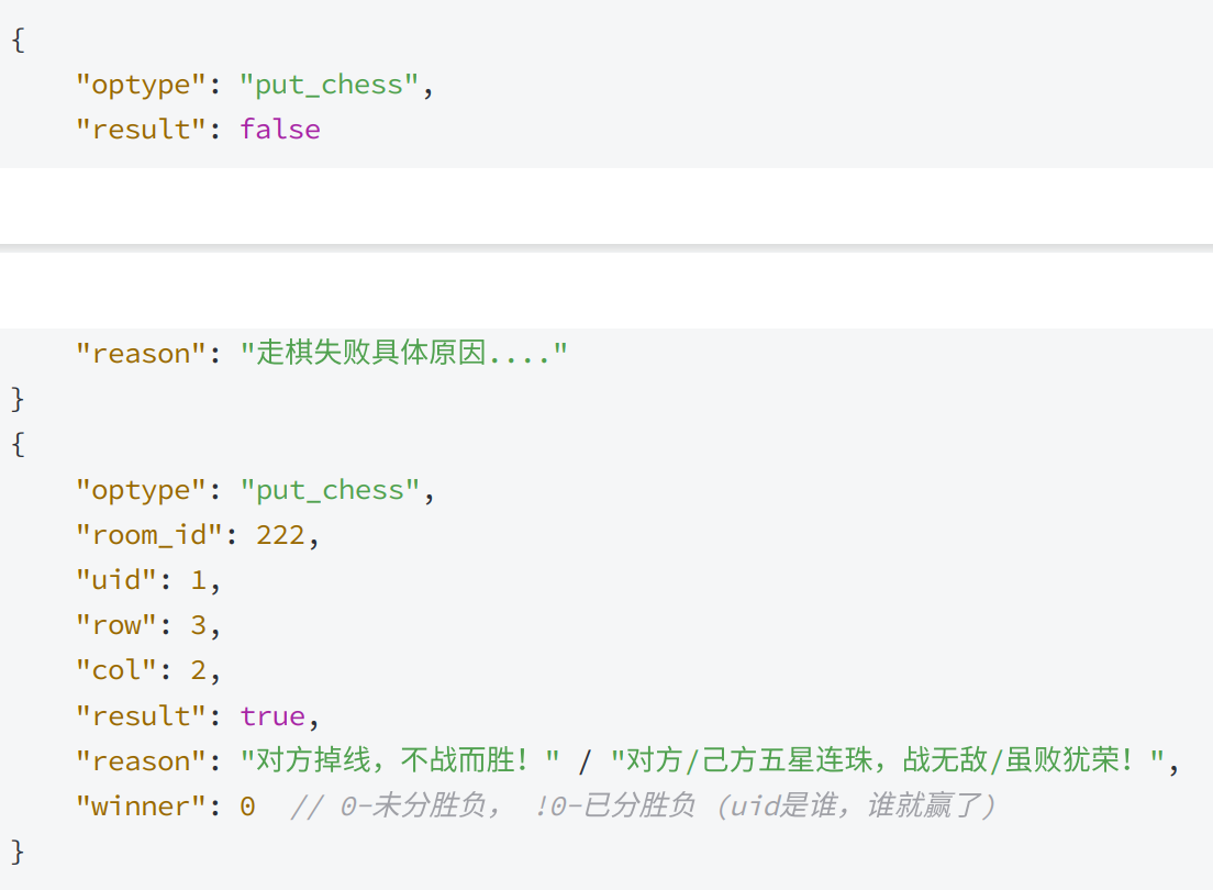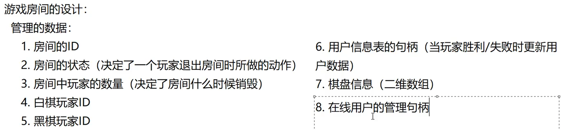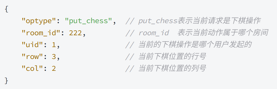 };class room{private:uint64_t _room_id;room_status _status;int _player_count;uint64_t _white_id;uint64_t _black_id;user_table* _tb_user;online_manager* _online_user;std::vector<std::vector<int>> _board;private:uint64_t check_win(int row,int col,int color){//从四个不同的方向上检测是否出现了五个及以上的相同颜色的格子return ;/*返回胜利玩家的ID,否则没有胜利者返回0*/}public:room(uint64_t room_id,user_table* tb_user,online_manager* online_user):_room_id(room_id),_status(GAME_START),_player_count(0),_tb_user(tb_user),_online_user(online_user),_board(BOARD_ROW,std::vector<int>(BOARD_COL,0)){DLOG("%lu 房间创建成功!!",_room_id);}~room(){DLOG("%lu 房间销毁成功!!",_room_id);}uint64_t id(){return _room_id;}room_status status(){return _status;}int player_count(){return _player_count;}void add_white_user(uint64_t uid){_white_id = uid;_player_count++;}void add_black_user(uint64_t uid){_black_id = uid;_player_count++;}uint64_t get_white_user(){return _white_id;}uint64_t get_black_user(){return _black_id;}//处理下棋动作Json::Value handle_chess(Json::Value &req){}//处理聊天动作Json::Value handle_chat(Json::Value &req){}//处理退出动作void handle_exit(uint64_t uid){}//总的请求处理函数,区分请求类型,根据不同的请求调用不同的处理函数,得到响应进行广播void handle_request(Json::Value& req){}//处理广播动作void broadcast(Json::Value &req){}