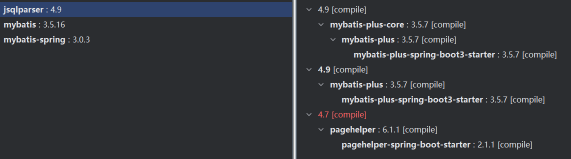 <dependency><groupId>com.baomidou</groupId><artifactId>mybatis-plus-spring-boot3-starter</artifactId><version>${mybatis-plus.version}</version><exclusions><exclusion><groupId>com.github.jsqlparser</groupId><artifactId>jsqlparser</artifactId></exclusion></exclusions></dependency><dependency><groupId>com.github.pagehelper</groupId><artifactId>pagehelper-spring-boot-starter</artifactId><version>${pagehelper.boot.version}</version><exclusions><exclusion><groupId>com.github.jsqlparser</groupId><artifactId>jsqlparser</artifactId></exclusion><exclusion><artifactId>mybatis</artifactId><groupId>org.mybatis</groupId></exclusion><exclusion><artifactId>mybatis-spring</artifactId><groupId>org.mybatis</groupId></exclusion></exclusions></dependency><!-- 此处需要指定jsqlparser版本为4.7,防止pagehelper集成的jsqlparser版本与mybatisplus集成的jsqlparser版本冲突 --><dependency><groupId>com.github.jsqlparser</groupId><artifactId>jsqlparser</artifactId><version>${jsqlparser.version}</version></dependency>