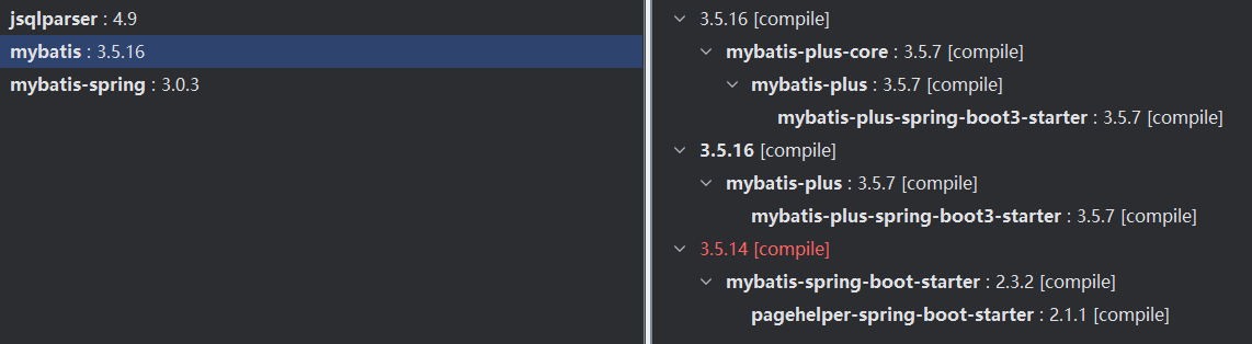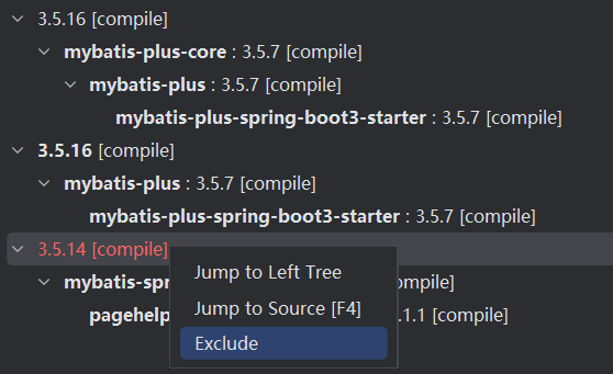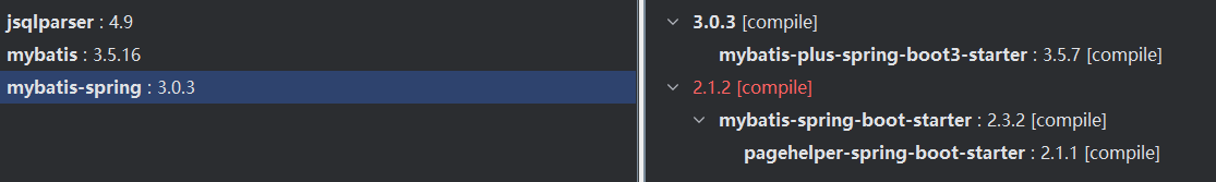 对于pagehelper-spring-boot-starter内部也集成了mybatis-plus-spring-boot-starter的依赖,但是版本较低: