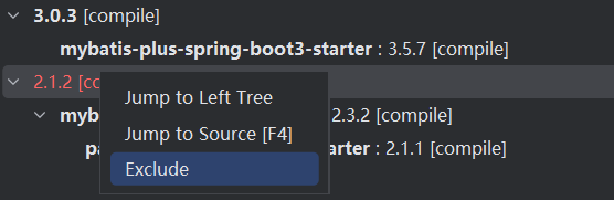 在发生依赖冲突的地方,右键,选择Exclude排除冲突依赖:
