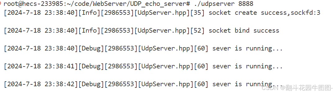 void Start(){//之前提到的判断服务是否还在运行的变量_isrunning = true;while(_isrunning)//服务一般都是一直运行的死循环{//接收char buffer[1024];struct sockaddr_in peer;//对client端构建sockaddrsocklen_t len = sizeof(peer);//必须初始化为sizeof(peer)/peer长度ssize_t n = recvfrom(_sockfd,buffer,sizeof(buffer)-1,0,(struct sockaddr*)&peer,&len);if(n > 0)//收到了{buffer[n]=0;//在接收数据的末尾手动添加空字符\0LOG(DEBUG,"服务端获取信息:%s\n",buffer);//你收到了才能发嘛sendto(_sockfd,buffer,strlen(buffer),0,(struct sockaddr*)&peer,len);}}_isrunning = false;}