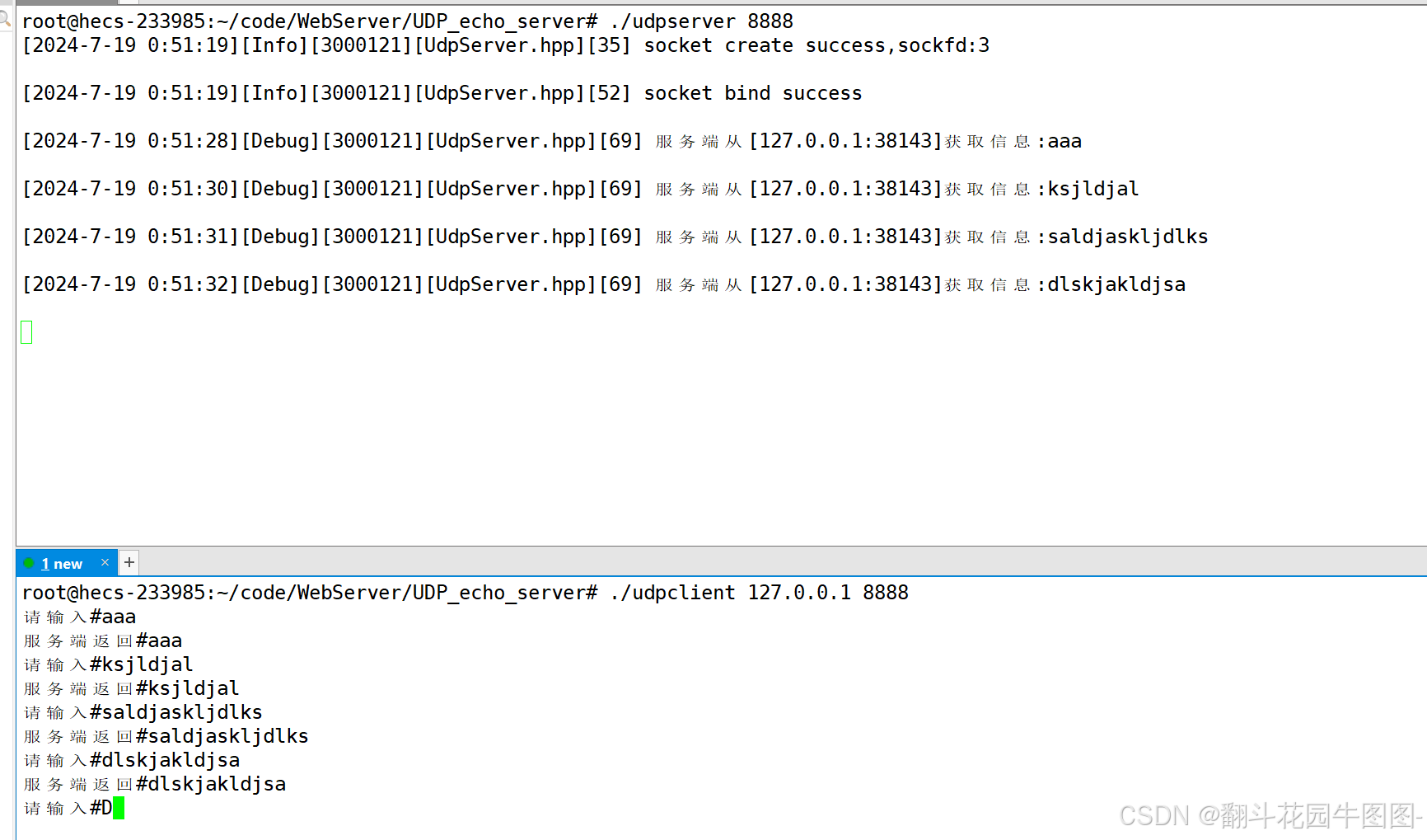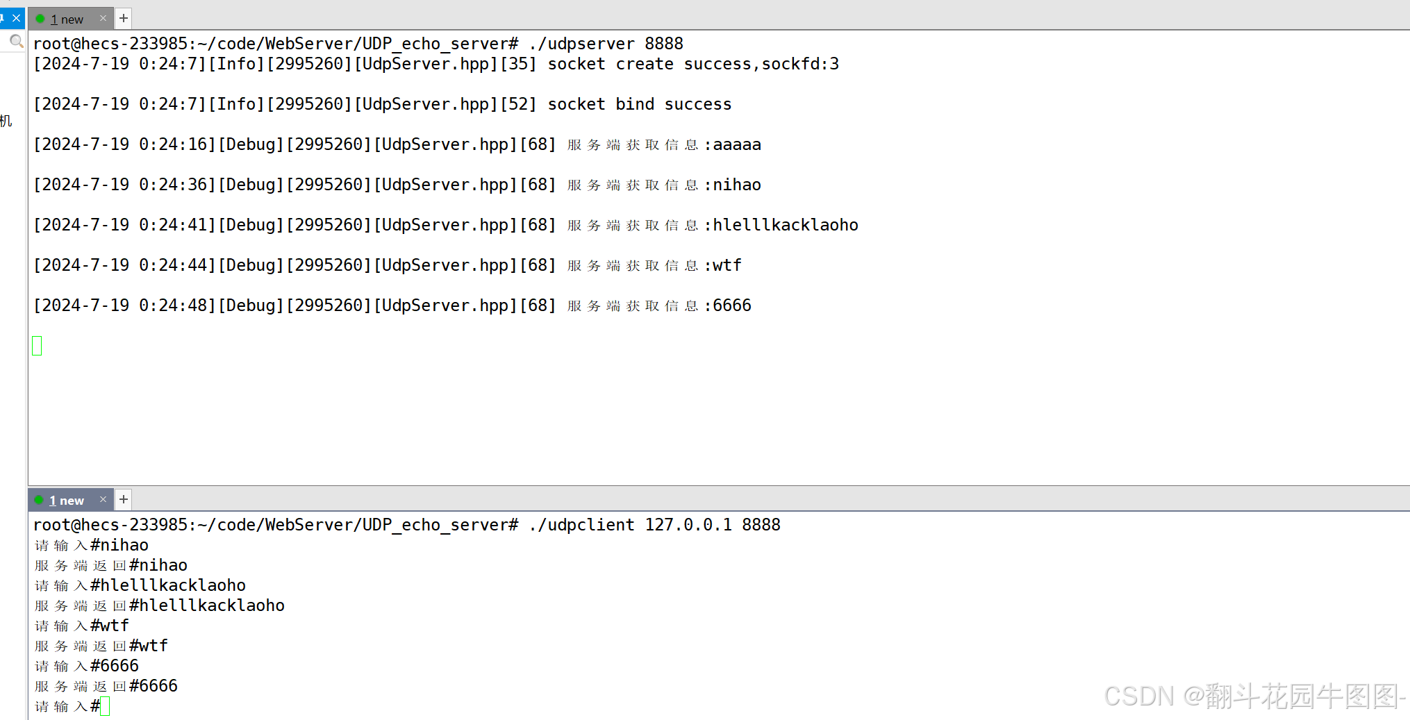 {if(argc != 3)//./client ip地址 端口号{Usage(argv[0]);exit(1);}std::string serverip = argv[1];uint16_t serverport = std::stoi(argv[2]);//client这边的步骤也差不多,需要注意的是,Udpclent不要显示的绑定,其首次发送数据时OS会自动随机的给client进行bind//创建socketint sockfd = socket(AF_INET,SOCK_DGRAM,0);if(sockfd < 0){std::cerr<<"socket error"<<std::endl;exit(2);}//填充 struct sockaddr_instruct sockaddr_in server;memset(&server,0,sizeof(server));server.sin_family=AF_INET;server.sin_port=htons(serverport);server.sin_addr.s_addr=inet_addr(serverip.c_str());//少了步显示绑定std::string messagebuffer;//通信while(true){std::cout<<"请输入#";getline(std::cin,messagebuffer);//先发送sendto(sockfd,messagebuffer.c_str(),messagebuffer.size(),0,(struct sockaddr*)&server,sizeof(server));//接收char buffer[1024];struct sockaddr_in peer;socklen_t len = sizeof(peer);ssize_t n = recvfrom(sockfd,buffer,sizeof(buffer)-1,0,(struct sockaddr*)&peer,&len);if(n > 0){buffer[n]=0;std::cout<<"服务端返回#"<<buffer<<std::endl;}}return 0;