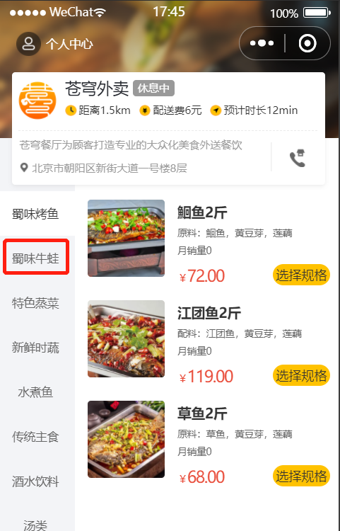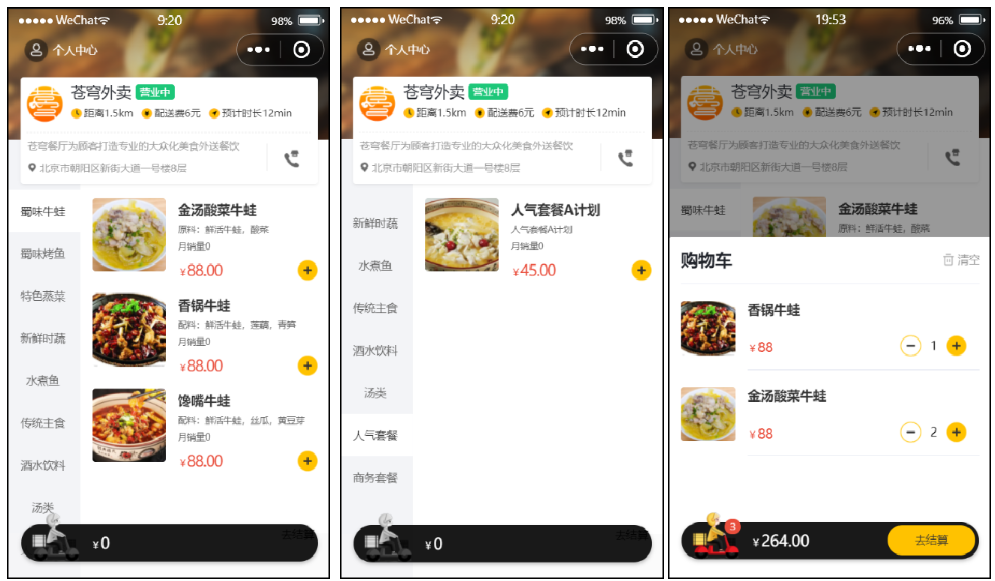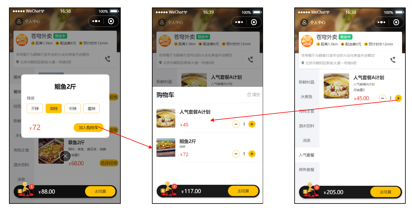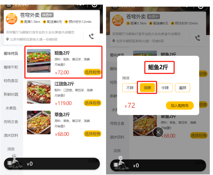 用户可以将菜品或者套餐添加到购物车。对于菜品来说,如果设置了口味信息,则需要选择规格后才能加入购物车;对于套餐来说,可以直接点击
