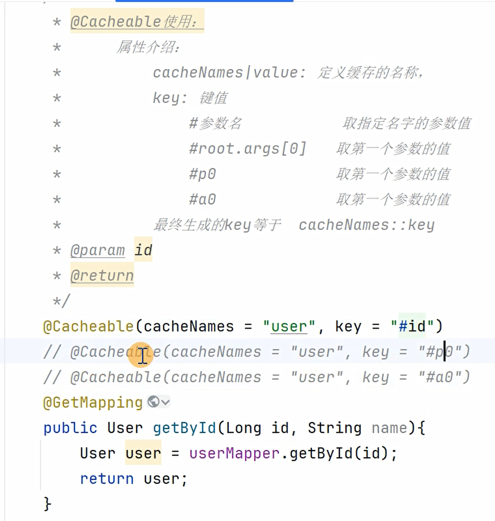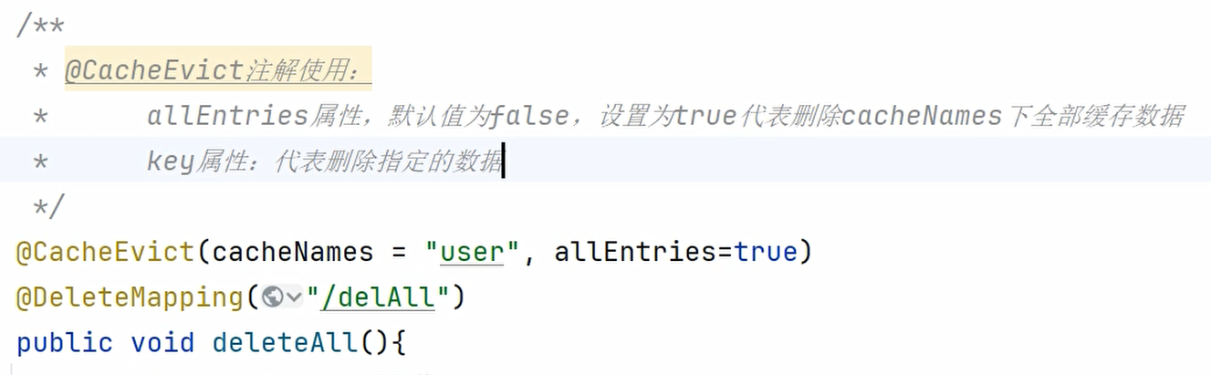 @DeleteMapping@CacheEvict(cacheNames = "userCache",key = "#id")//删除某个key对应的缓存数据public void deleteById(Long id){userMapper.deleteById(id);}@DeleteMapping("/delAll")@CacheEvict(cacheNames = "userCache",allEntries = true)//删除userCache下所有的缓存数据public void deleteAll(){userMapper.deleteAll();}