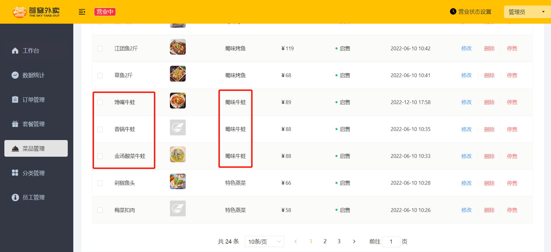 因为删除菜品可能是删除单个菜品,也有可能是批量删除,所以最简单的方法就是全部删除