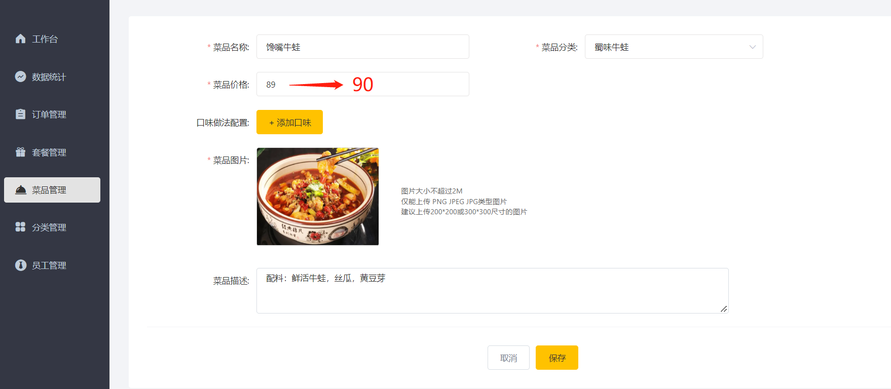 /*** 新增菜品** @param dto*/public void addDish(DishDTO dto) {//1.构造菜品基本信息数据,将其存入dish表中Dish dish = new Dish();//拷贝属性值BeanUtils.copyProperties(dto, dish);//调用mapper保存方法dishMapper.insert(dish);//TODOlog.info("dishID={}", dish.getId());//2.构造菜品口味列表数据,将其存入dish_flavor表中List<DishFlavor> dishFlavorList = dto.getFlavors();if (dishFlavorList != null && dishFlavorList.size() > 0) {//2.1 关联菜品iddishFlavorList.forEach(flavor -> {flavor.setDishId(dish.getId());});//2.2 调用mapper保存方法,批量插入口味列表数据dishFlavorMapper.insertBatch(dishFlavorList);}}