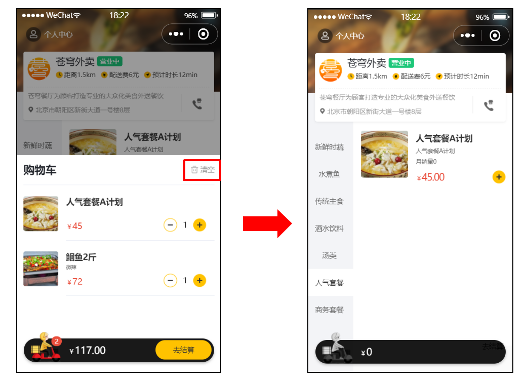 将当前套餐加入购物车。在购物车中可以修改菜品和套餐的数量,也可以清空购物车。