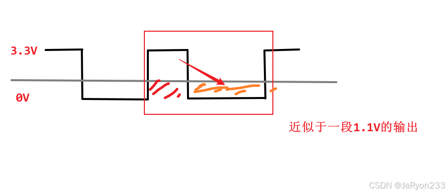 如上图,假如现在输出了一段PWM方波信号如上图所示,然后一个周期中处于高电平的部分大约只有整个周期的1/3,而高电平时输出的电压是3.3V左右,低电平输出的认为是0V,每一个周期的波形都长这样,那么我们可以认为:这一段连续输出的方波信号就可以等效看成1.1V左右的电压输出,换句话说,每个周期的高电平与低电平进行了“面积”上的等效一样,因为整个输出的不是一直都为3.3V,也不是一直是0V,因此输出的电压近似就是处于0~3.3V之间的,只要输出的频率够高,就可以等效近似为一段稳定的处于0到3.3V之间的电压输出了。