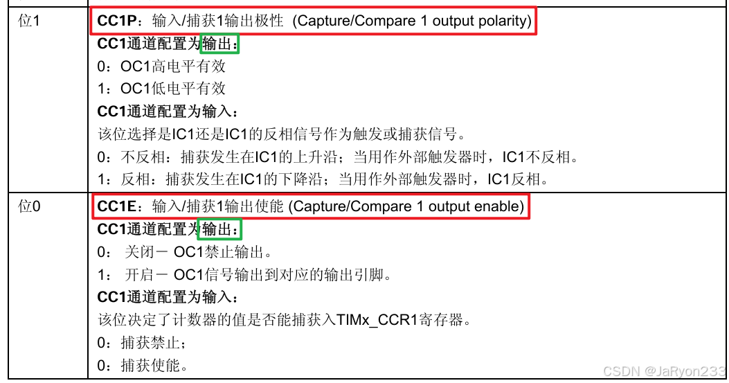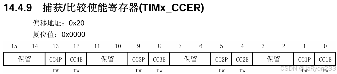 可以发现,CCER寄存器直接负责4个通道的配置,每个通道刚好有两个配置的位,分别是CCxP位和CCxE位。从图中介绍可以知道:CCxP位表示通道极性,通道为输出时用来设置有效电平为高还是为低,通道为输入时用来设置捕获产生的时机,是反相还是不反相;CCxE位表示的是通道使能,通道为输出时就是开启输出还是禁止输出,通道为输入时就是使能捕获还是禁止捕获。