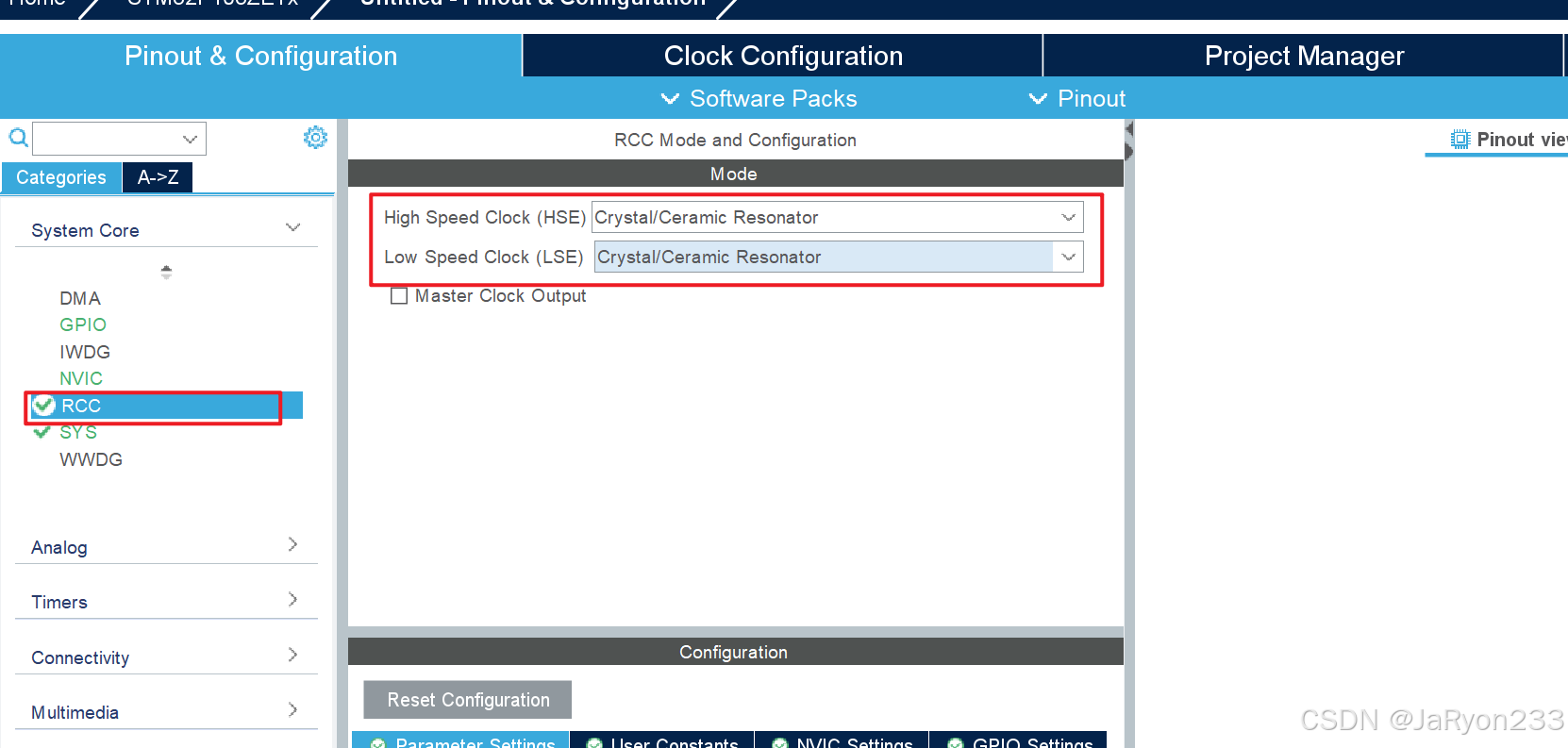 然后配置一下时钟。选择【RCC】,然后选择HSE和LSE均为石英晶体震荡【Crystal/Ceramic Resonator】。如下图所示。