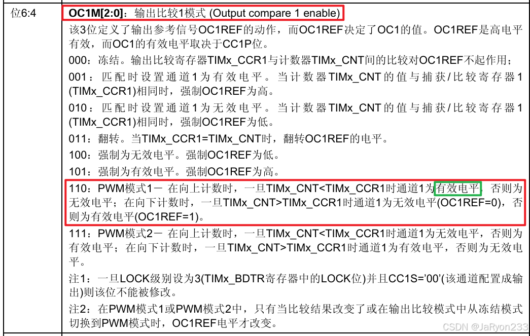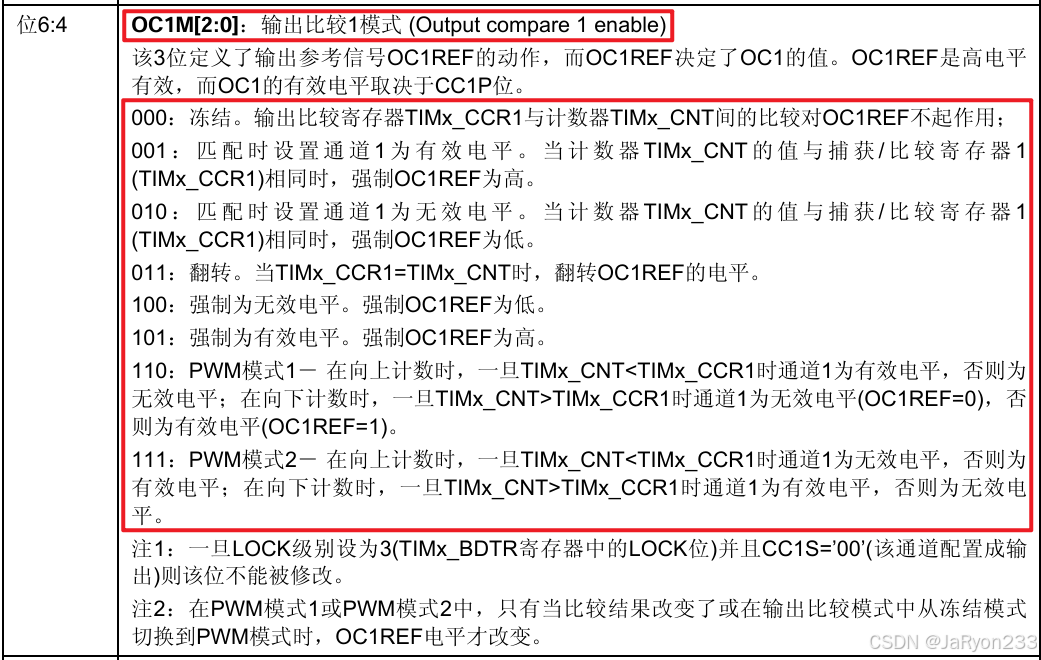 1、OC1M[2:0] = 000时,比较模式为输出冻结,此时CNT和CCR的比较结果不会影响输出,也就是不使用这个功能,即默认不开启输出比较;