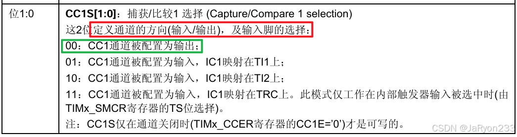 其次,CCxS是用来配置通道方向的,所谓的通道方向就是指这个通道是用来进行输出还是输入,其介绍如下图所示。