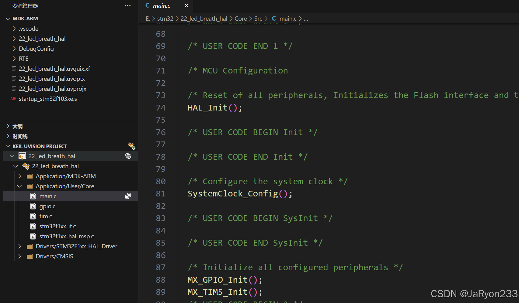 最后,我们就可以直接在main.c中进行初始化以及呼吸灯逻辑的补充了。