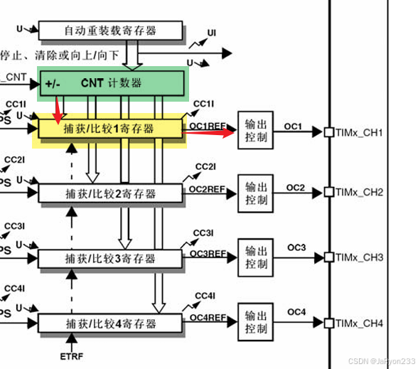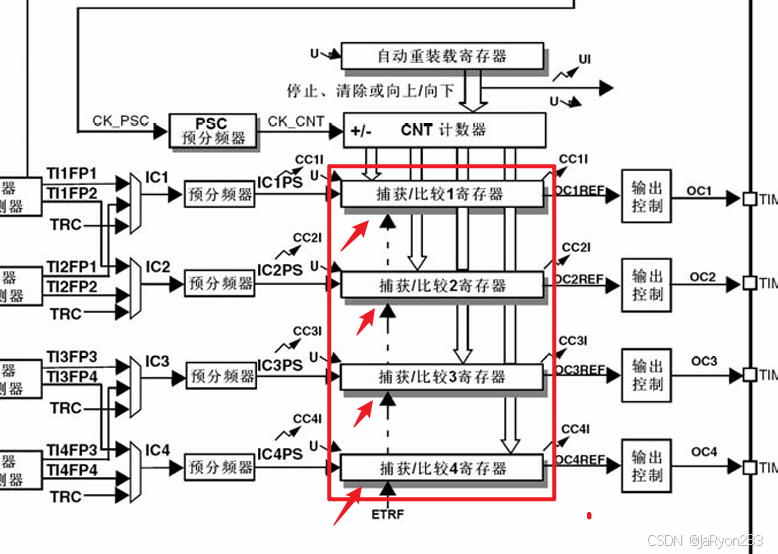 其次是比较模块,也就是捕获/比较寄存器部分。看图可知,每个通用定时器含有四个捕获/比较寄存器,也就是说一个定时器可以同时进行4路的输出比较;