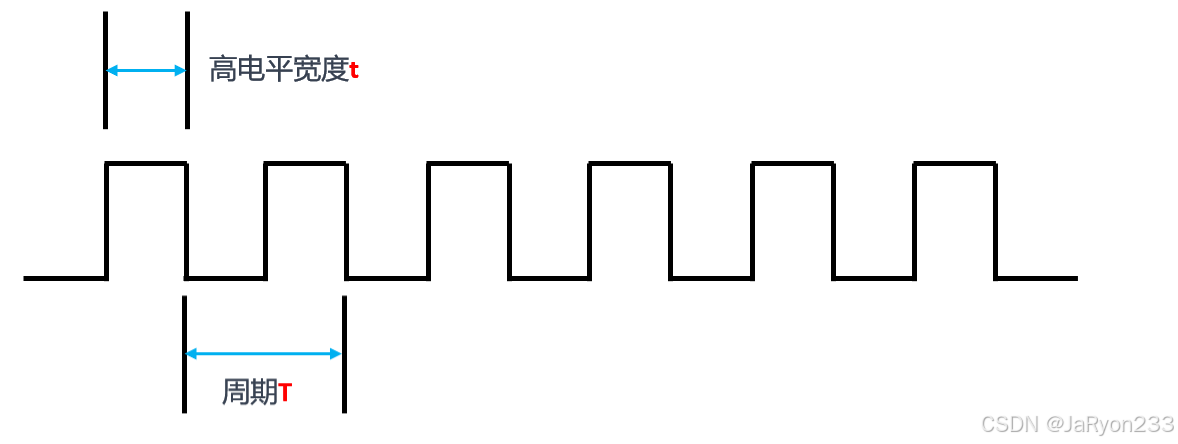 这是一段PWM方波,其中所谓的周期就是指这段PWM波中连续两个上升沿或下降沿之间间隔的时间,一般用大写字母T表示;所谓的频率就是指周期的倒数,一般用小写字母f表示,即f = 1 / T;而占空比表示的就是PWM波的一个周期中高电平时间t(或者是高电平宽度)所占整个周期的比例,即t / T。