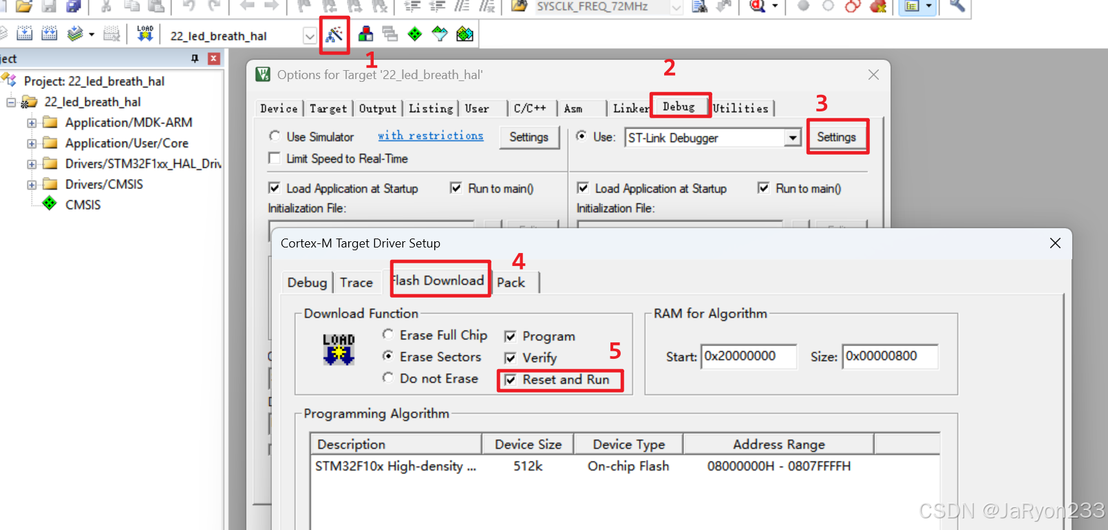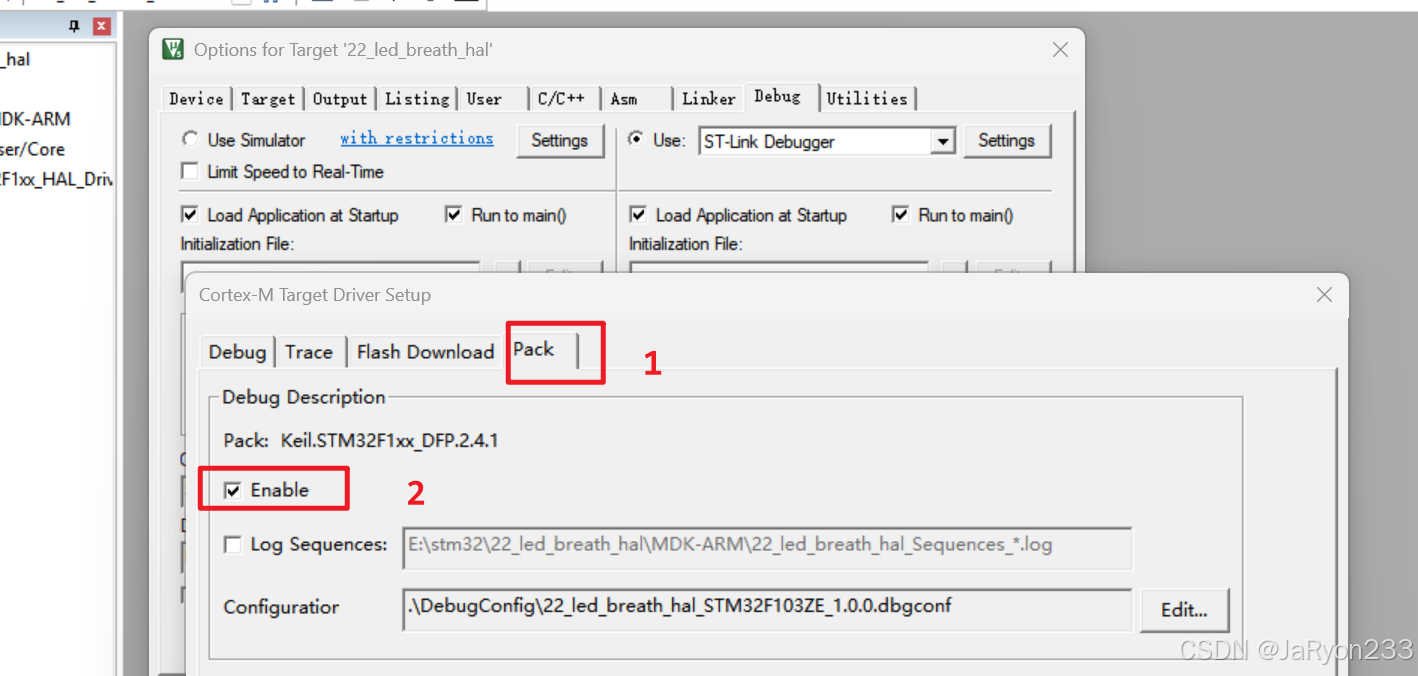 keil中主要是简单设置一下debug的内容。进入【魔法棒】,然后选择【Debug】,进入【Settings】,然后选择【Flash Download】,勾选上【Reset and Run】;然后进入【Pack】,取消勾选【Enable】即可。