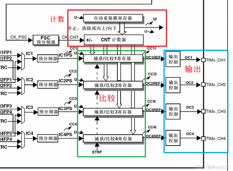 图中所框的部分就是输出比较功能实现的构成部分。由图可以看出,其主要包括了三大部分,分别是计数模块、比较模块(捕获/比较寄存器)以及输出模块。