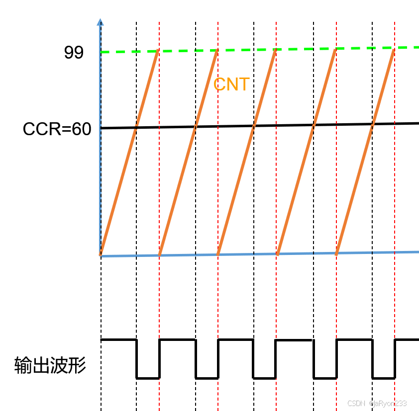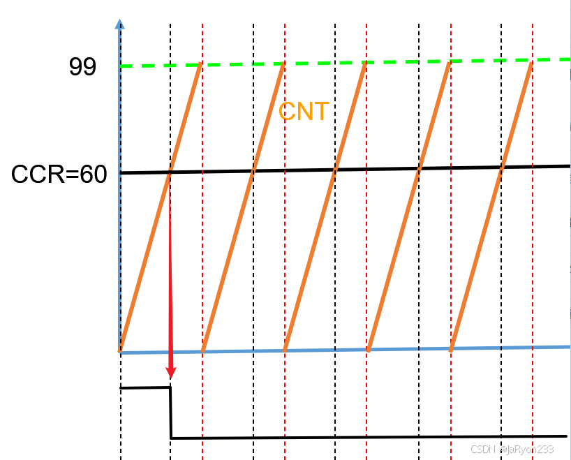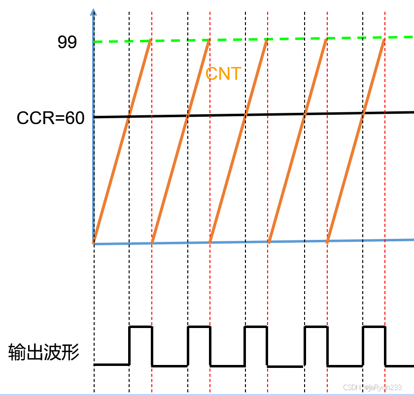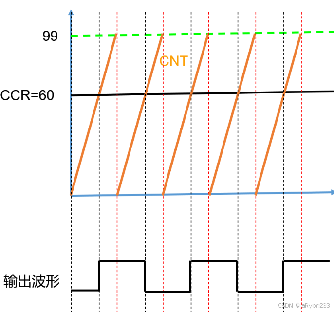 假设此时设置的自动重装载值为99,计数方式为向上计数,也就是说实际计数100次会产生一次溢出事件,然后如果捕获/比较寄存器CCR中设置的值为60,那么其核心思想就是CNT计数器中的值会与捕获/比较寄存器中设置的值进行比较,根据比较结果(如大于、等于或小于),来产生不同的输出信号OCxREF(如高电平1或者低电平0)。