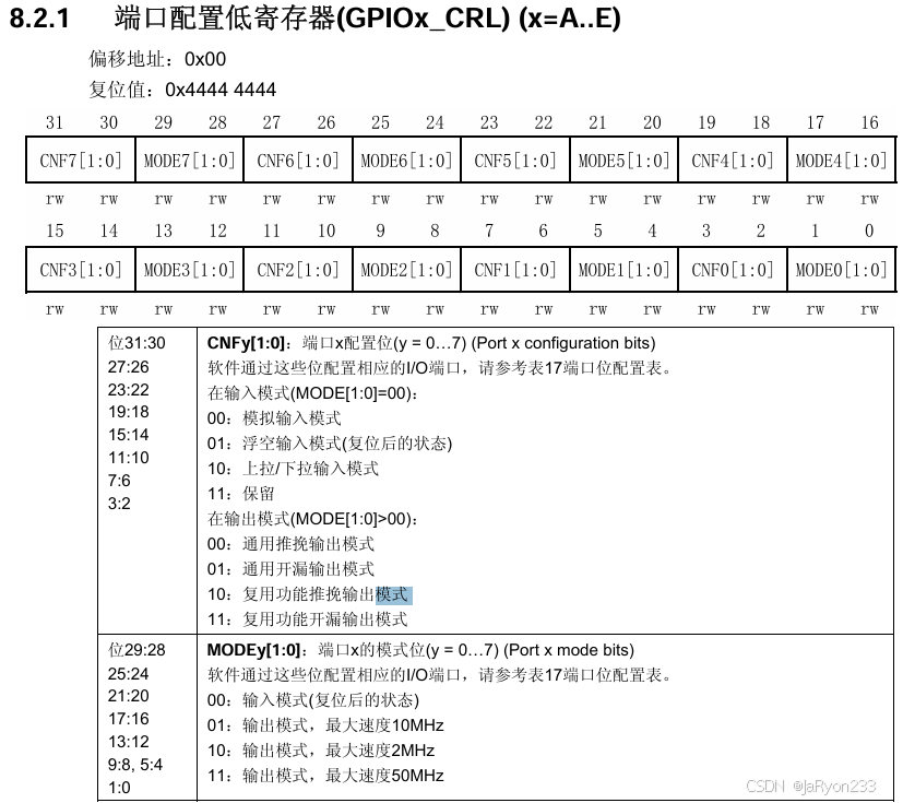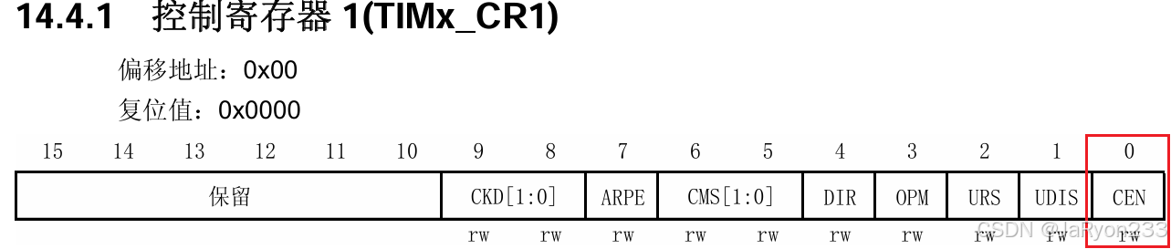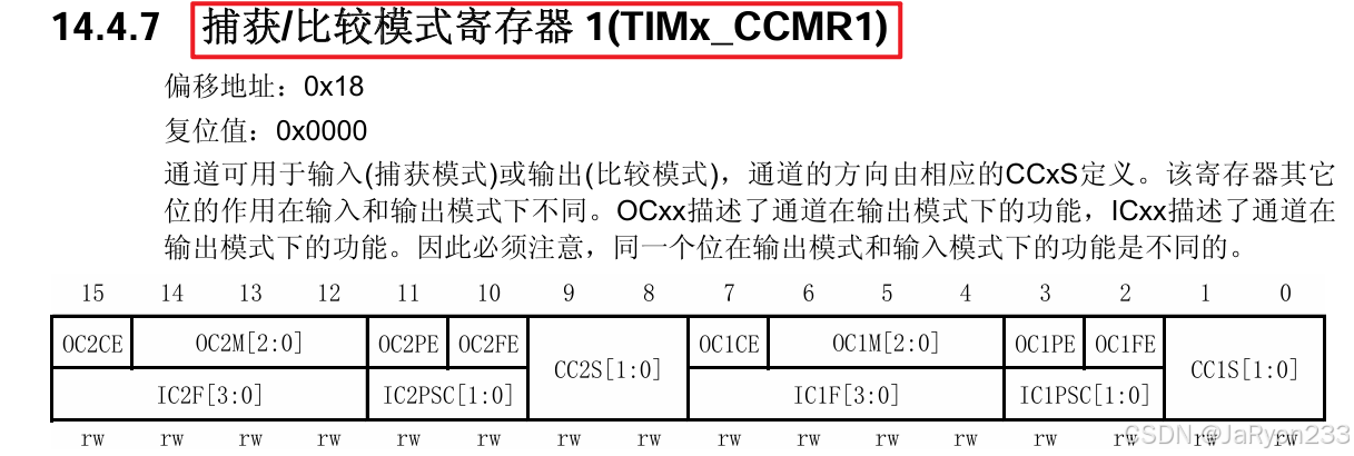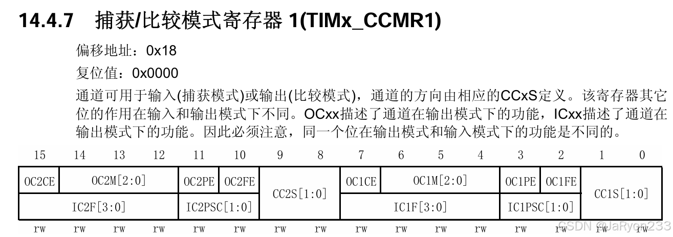 从图中可以看出,这个寄存器和之前见过的有些不一样,他有两行位,但是只有16位,原因在于这一个寄存器要负责两种功能的配置,所以使用两行列出来了。然后一个CCMR寄存器负责两个通道的配置,因此由图可以发现其中低8位负责的通道1的相关配置、高8位负责的通道2的相关配置,其位名字中分别是1或2,也很好区分。