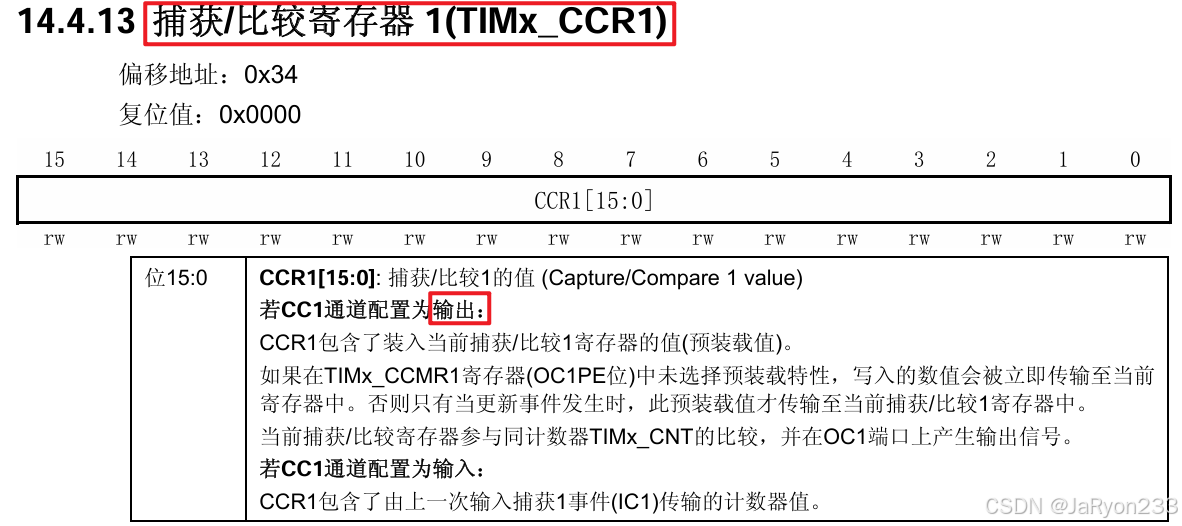 CCR寄存器,也就是捕获/比较寄存器,在通道配置为输出时用于设置比较值,通道配置为输入时用于存放计数器值,如下图所示。