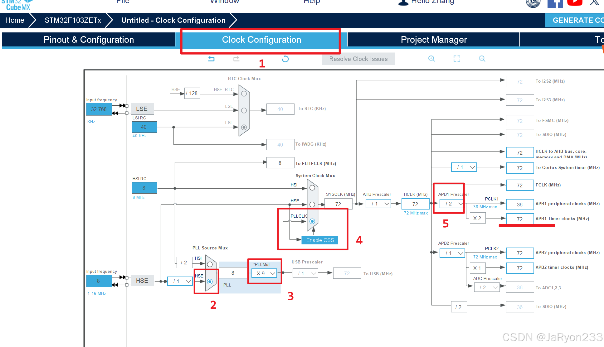 接着点击【Clock Configuration】配置一下时钟树,选择HSE,9倍频,然后APB1部分进行2分频,如下图所示。